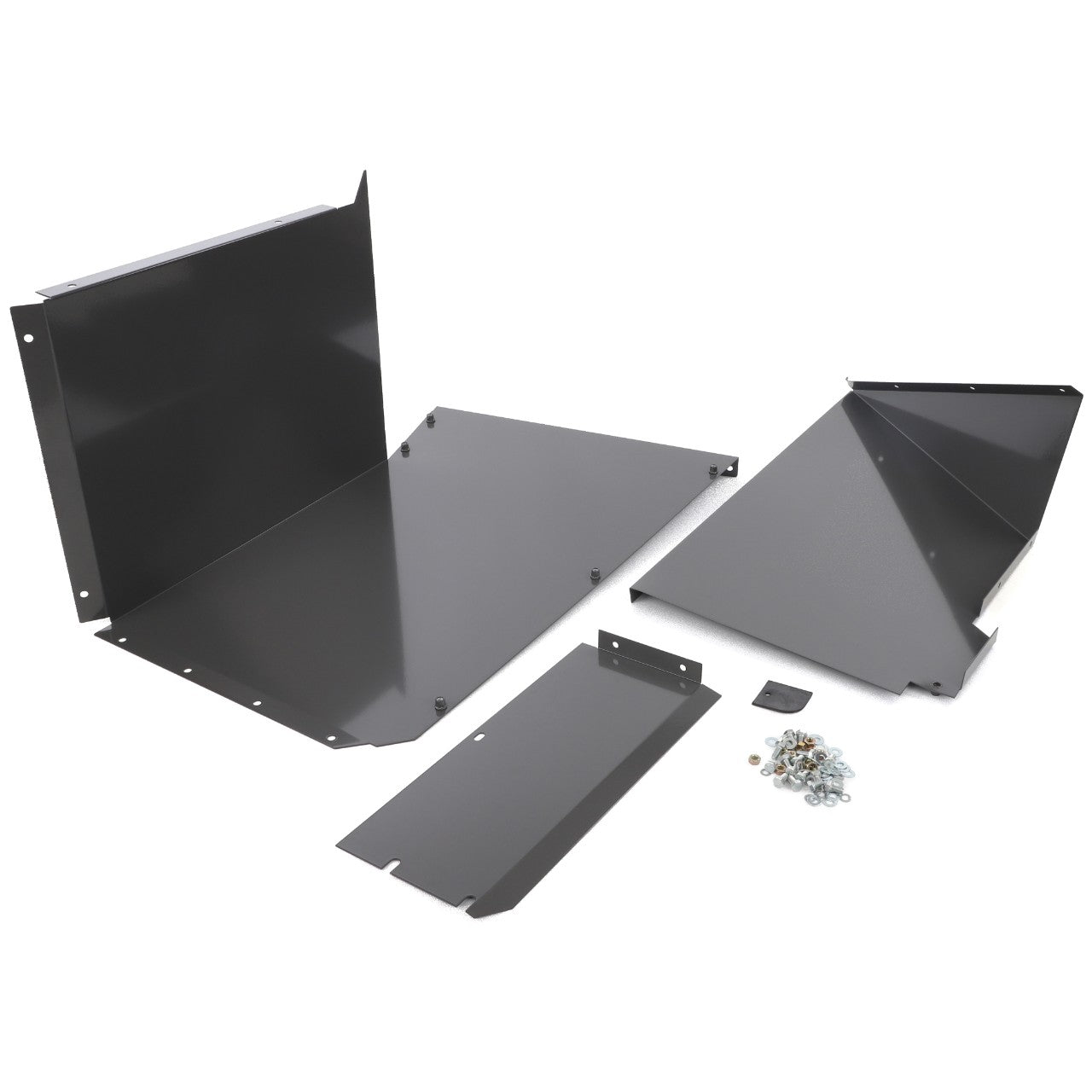 The AGCO Inner Protection Of Grain Tank Unloading - Acw1517680, featuring a set of black metal panels and various hardware pieces, is laid out on a white background, presumably for assembly purposes.